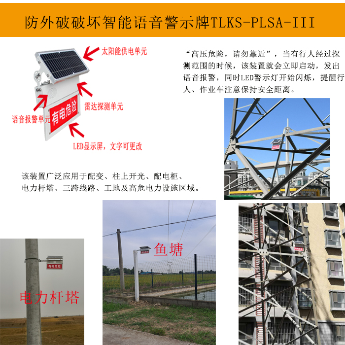 TLKS-PLSA-III線路防外力破壞智能警示牌廣泛適用于配變、柱上開關、配電柜、電力桿塔、三跨線路、工地及高危電力設施區域,為這些關鍵區域提供強有力的安全保障。