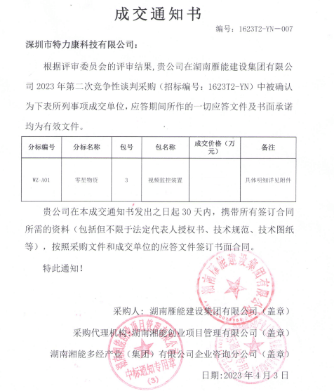 根據評審委員會的評審結果,我司在湖南雁能建設集團有限公司2023年第二次競爭性談判采購(招標編號: 1623T2--YN) 中被確認為下表所列事項成交單位,中標通知如下: