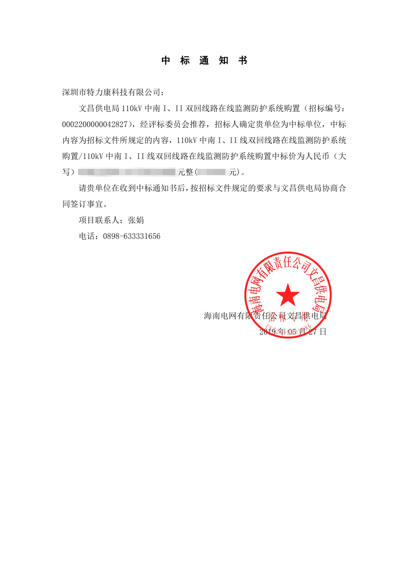 經(jīng)評標(biāo)委員會(huì)推薦,文昌招標(biāo)單位,確定我司(深圳市特力康科技有限公司)為文昌供電局雙回線在線監(jiān)測防護(hù)系統(tǒng)項(xiàng)目中標(biāo)單位,現(xiàn)將中標(biāo)公告公示。