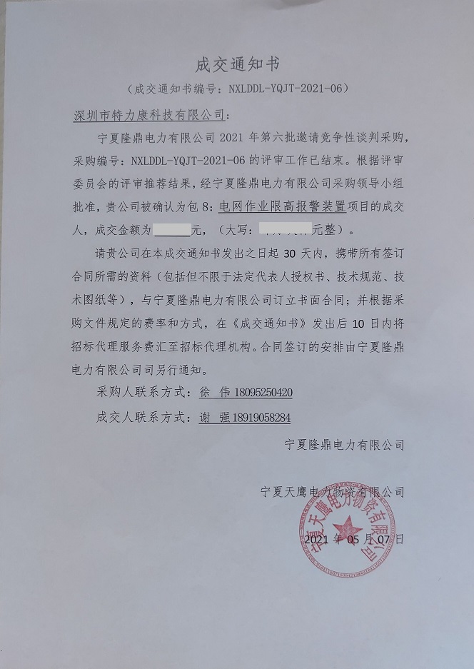 寧夏隆鼎電力有限公司2021年第六批邀請競爭性談判采購,采購編號: NXLDDL-YQJT -2021-06的評審工作已結束。根據(jù)評審委員會的評審推薦結果,經(jīng)寧夏隆鼎電力有限公司采購領導小組批準,我司被確認為包8:電網(wǎng)作業(yè)限高報警裝置項目的成交人,中標通知如下: