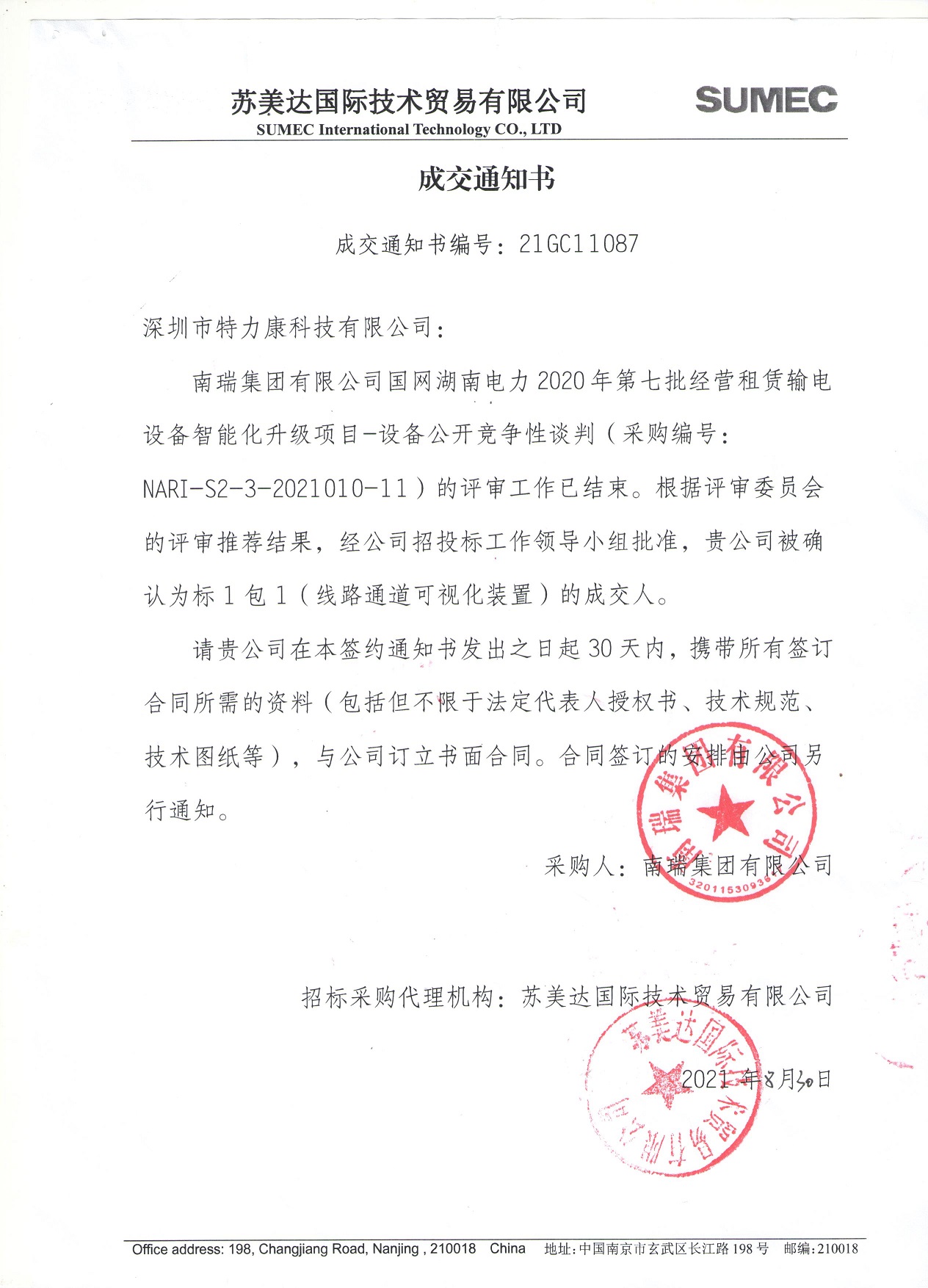 南瑞集團有限公司國網湖南電力2020年第七批經營租賃輸電設備智能化升級項目-設備公開競爭性談判(采購編號:NARI-S2-3-2021010-11 )的評審工作已結束。根據評審委員會的評審推薦結果,經公司招投標工作領導小組批準,我司被確認為標1包1 (線路通道可視化裝置)的成交人。中標公告如下: