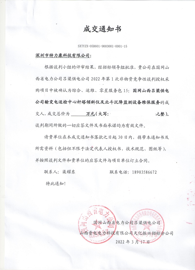 根據(jù)談判小組的評(píng)審結(jié)果,經(jīng)招標(biāo)領(lǐng)導(dǎo)組批準(zhǔn),我司在國(guó)網(wǎng)山西省電力公司呂梁供電公司2022年第1次非物資競(jìng)爭(zhēng)性談判授權(quán)采購(gòu)項(xiàng)目中被確認(rèn)為綜合、運(yùn)維、零星服務(wù)包15:國(guó)網(wǎng)山西呂梁供電公司輸變電運(yùn)檢中心桿塔傾斜儀及北斗沉降監(jiān)測(cè)設(shè)備維保服務(wù)的成交人,成交通知如下: