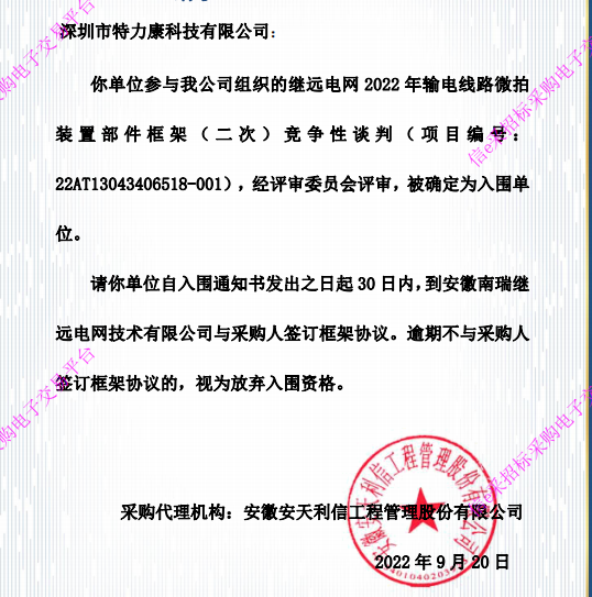 深圳市特力康科技有限公司:你單位參與我公司組織的繼遠(yuǎn)電網(wǎng)2022年輸電線路微拍裝置部件框架(二次)競爭性談判(項目編號:22AT13043406518- 001) ,經(jīng)評審委員會評審,被確定為入圍單位。中標(biāo)通知如下: